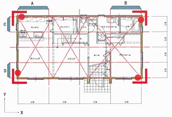 耐震性は壁の強度もさることながら、重要なのは強度のある壁の‘バランス’と上下階の壁や柱の位置を同じくする‘直下率’です