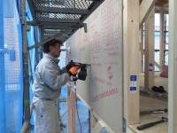 この資材は壁の強度は通常の下地材に比べ約2倍と強く、撥水加工されているので建築時雨に降られても水を含み強度が落ちる心配はありません