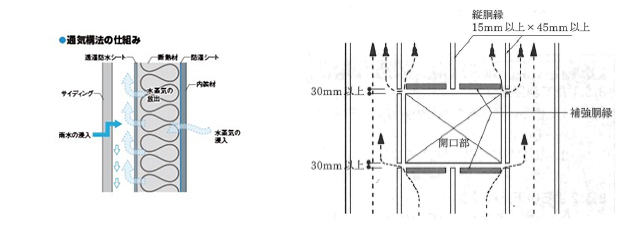 住宅の外装材の内側で躯体との間に一定の隙間を設け、その上下端を開けておくことで、外気が流出入できる「通気層」を作る工法です