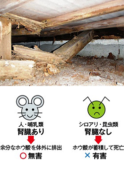 腎臓の無い白蟻を含む昆虫類は、ホウ酸塩を浄化できず、 死亡してしまいますが、人間などの哺乳動物が万が一ホウ素を、口にしても腎臓の浄化作用で短期間に排せつされます